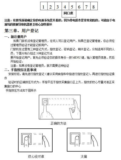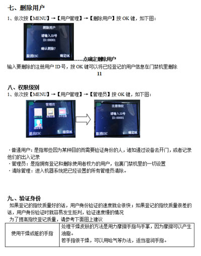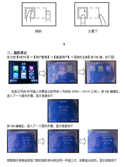 最終指紋還是無(wú)法識(shí)別的用戶,可將該指紋刷次再重新注冊(cè),或注冊(cè)另一枚手指,這樣的用戶在注冊(cè)時(shí)需要選擇使用質(zhì)量較好的指紋(指紋清晰等),盡量使用手指接觸指紋采集頭面積大一些,注冊(cè)完成后做一下對(duì)比測(cè)試,并建議多注冊(cè)幾枚備用指紋。